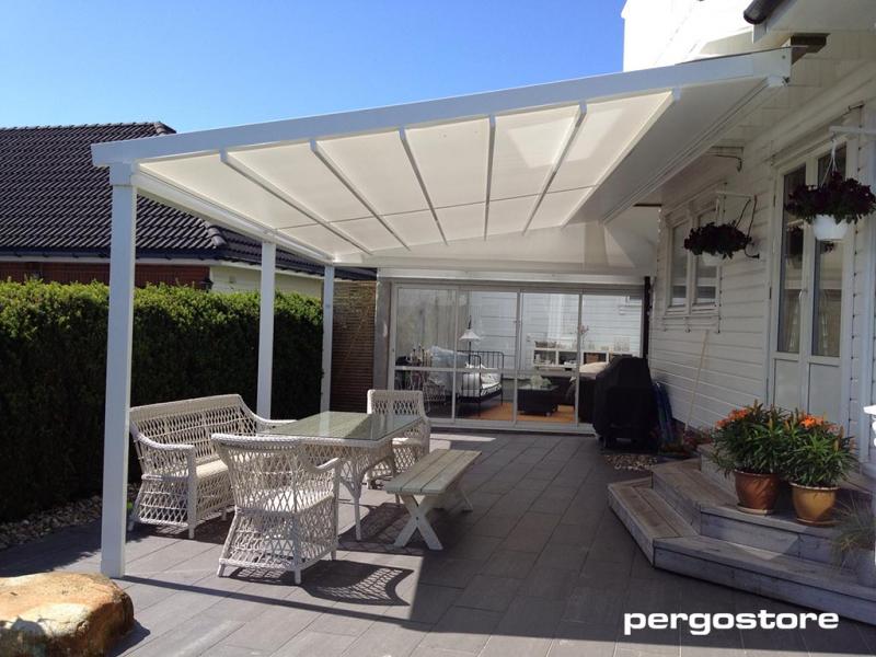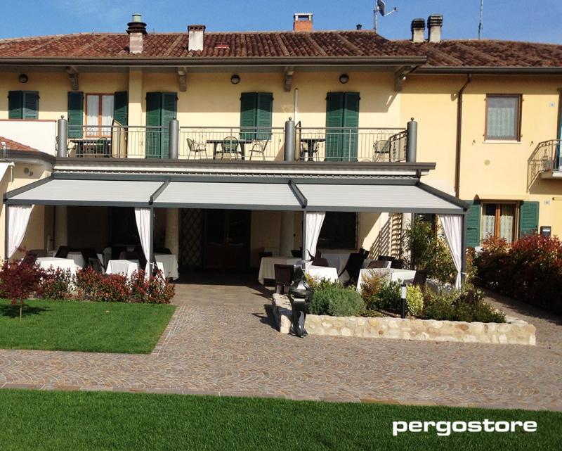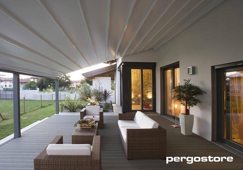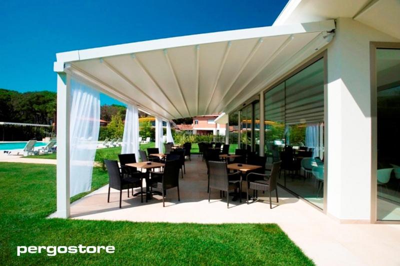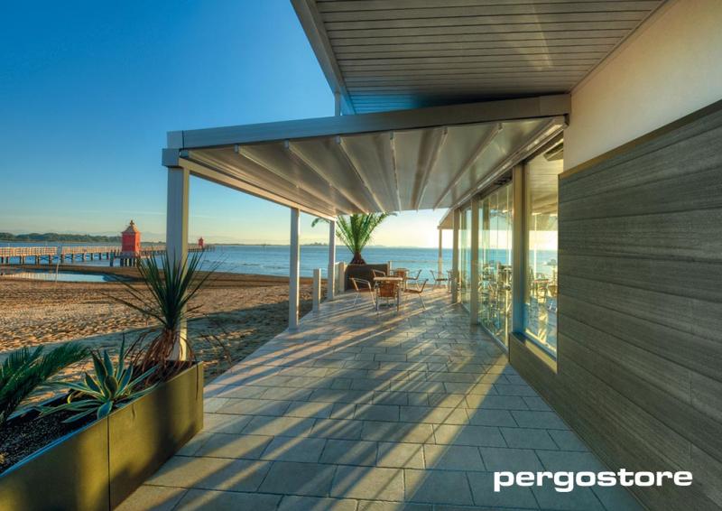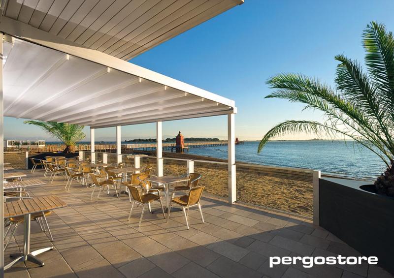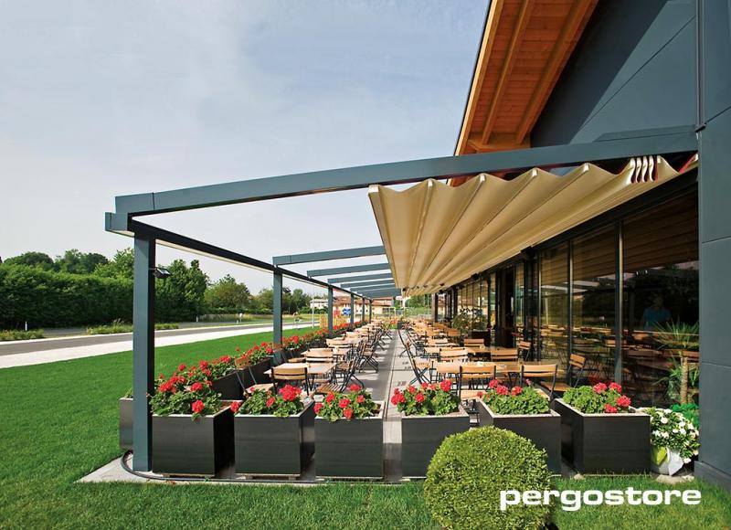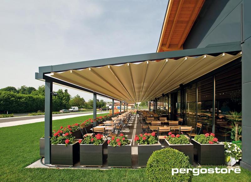 Pergostore ZEN est une structure auvent à poser en applique sur un mur avec toile en suspension tendue et système anti-gouttes avec pente de toit minimum. Il s’intègre à toutes les terrasses, et offre une solution originale et design aux grandes terrasses des restaurateurs. Il combine la flexibilité du store avec la robustesse d'une structure en aluminium.